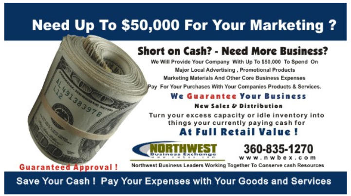 Northwest Business Exchange offers you, the business leader, an innovative and highly effective tool to eliminate the need to pay cash for marketing, advertising, promotion and other core business expenses.Your business purchases the things you need through our vast network of affiliated business members using a credit line supplied byNW Business Exchange.You pay for your purchases over time with new sales, out of excess inventory or spare capacity.By making purchases using your own products and services you create a cost level equal to your incremental cost ofgoods sold, saving you 40% , 50% or more